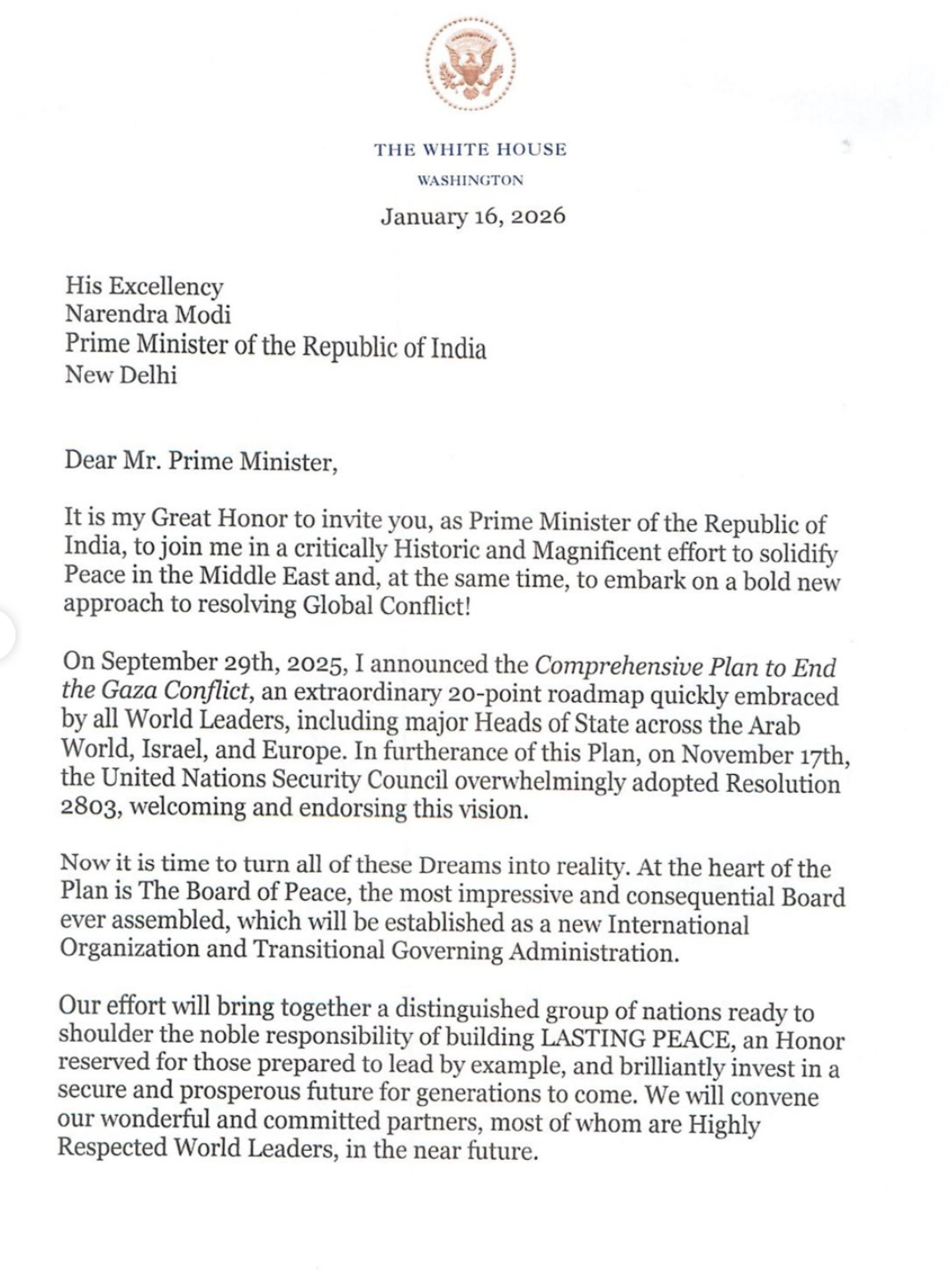 India's inclusion reflects Trump's broader vision of creating an international coalition to manage Gaza's transition from conflict to peace and development.